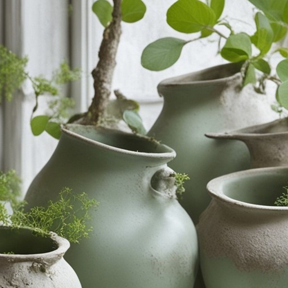 Vieilles poteries rondes en pierre de couleur vert tendre blanc gris sur un rebord de fenêtre crépi blanc gris devant la fenêtre, une image paisible pour l'inspiration de votre chambre ou de votre cuisine.