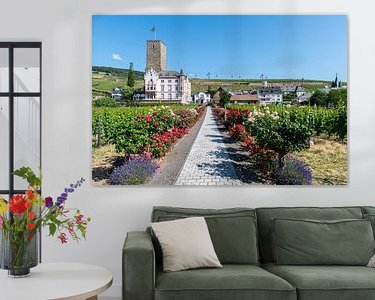 Chemin d'accès parmi les vignes d'un domaine viticole près de Rüdesheim am Rhein. Le téléphérique menant au monument du Niederwald est visible à l'arrière-plan.