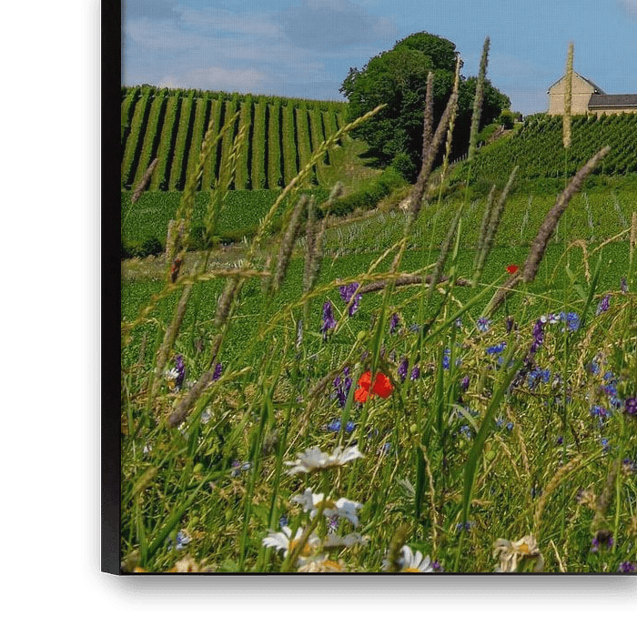 Le rythme des rangées de vignes et les fleurs colorées au premier plan apportent paix et équilibre à ce paysage qui ressemble à une tranche d'Europe méridionale, tout près de chez nous.