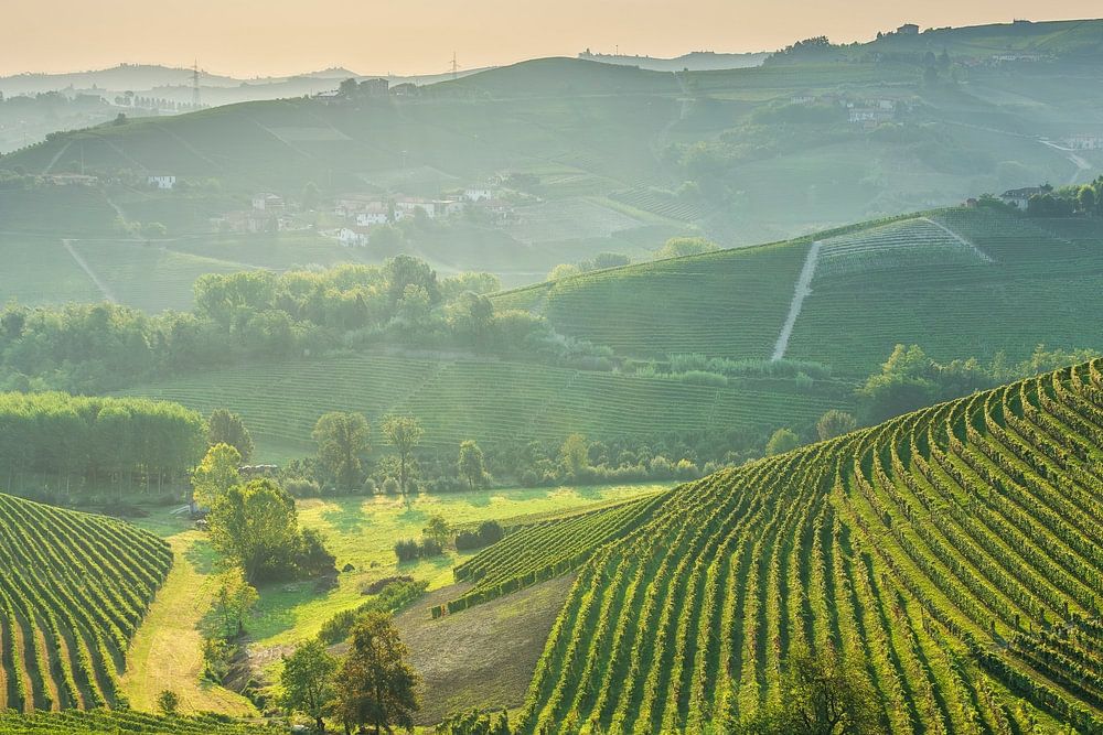 Vue matinale des vignobles des Langhe et du village de Neive en arrière-plan. Région du Piémont, Italie, Europe.