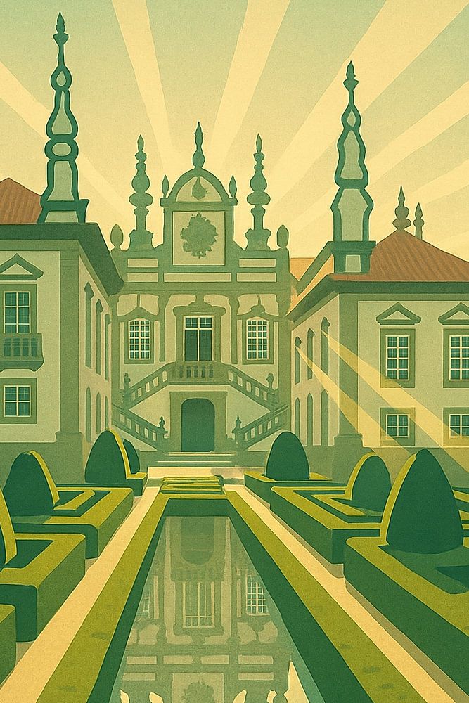 Cette affiche de Vila Real illustre la beauté raffinée des jardins du palais Mateus, symbole de l'architecture baroque portugaise. Les haies symétriques et le bassin réfléchissant conduisent le regard vers la façade du palais, tandis que des faisceaux de lumière rayonnants mettent en valeur ses tours ornées. Présenté dans une esthétique Art déco stylisée, le design équilibre la nature, la symétrie et l'élégance. Vila Real, située dans le nord du Portugal, est connue pour ses palais nobles, ses vignobles et les magnifiques paysages du Douro. Cette œuvre d'art capture ce charme aristocratique et le transforme en une impression décorative intemporelle. Parfait pour les amateurs de jardins historiques, d'architecture et de voyages en Europe, cet art mural Vila Real ajoute une touche de raffinement à n'importe quel espace. Qu'il soit accroché dans un bureau, un salon ou un espace de travail créatif, il évoque la sophistication, l'harmonie et la fierté culturelle portugaise.
