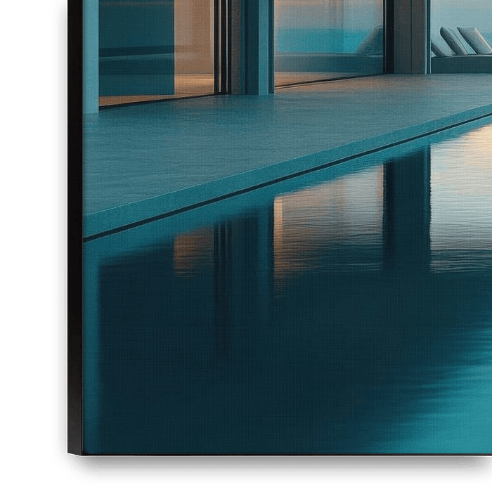 Mots-clés : photo de piscine à débordement, photographie de paysage marin, art de villa moderne, photographie et peintures Bowiscapes, image côtière minimaliste, paysage marin apaisant, décoration murale luxueuse, art d'intérieur estival, photo de vacances moderne, paysage aquatique relaxant