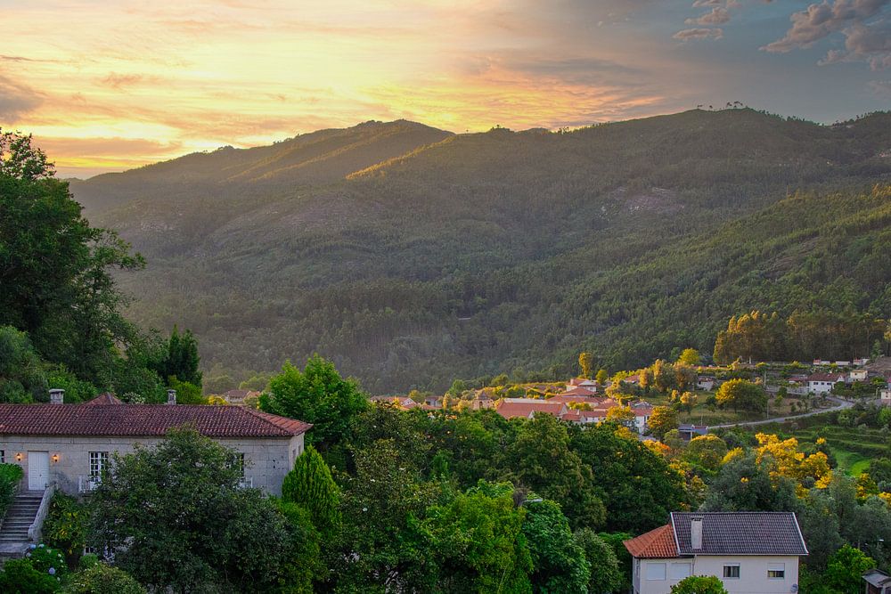 Panorama, photo de paysage d'une villa classique à Parada do Bouro, dans un paysage de montagne verdoyant alors que le soir tombe.
