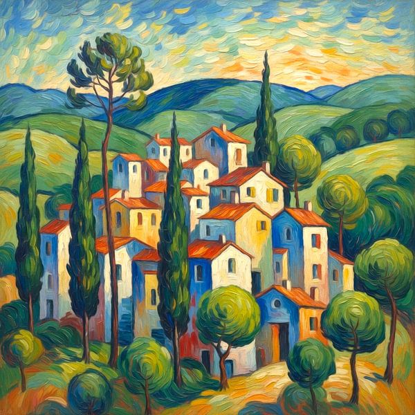 Une représentation vivante d'un village pittoresque niché au cœur de collines vallonnées. De grands cyprès et des toits colorés composent un décor plein de vie.