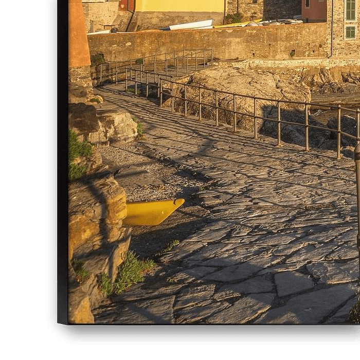 Le village de Tellaro au coucher du soleil. L'église et un petit bateau dans la mer.