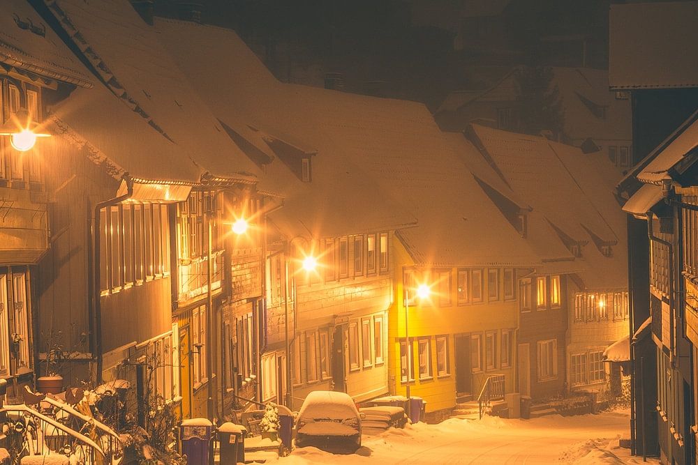 "Dans un village de montagne enneigé, la nuit, un paysage hivernal enchanteur se déploie. Les charmantes maisons sont délicatement recouvertes d'une épaisse couche de neige fraîche et leurs fenêtres diffusent une lumière chaude qui illumine l'obscurité. Les lampadaires le long de la route enneigée brillent d'un jaune accueillant et projettent de douces ombres sur la neige scintillante. L'atmosphère paisible n'est troublée que par le léger crissement de la neige sous les pieds. L'ensemble de la scène dégage une atmosphère paisible et romantique qui transporte le spectateur dans un monde de conte de fées hivernal".