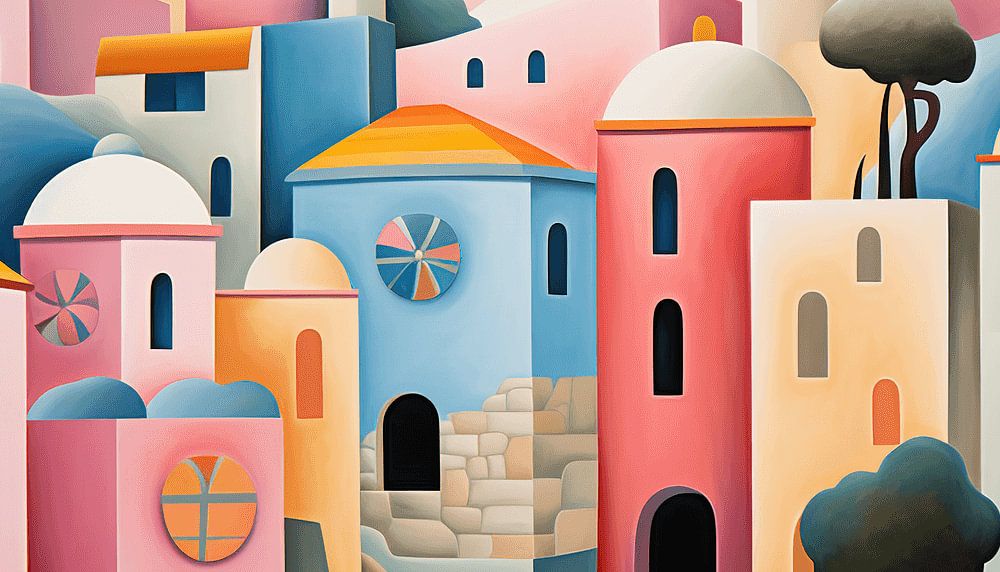 Cette peinture fait partie d'une série intitulée "Une tapisserie de tradition et de modernité", qui explore la beauté et le charme des rues de ville qui mêlent l'ancien et le nouveau, le culturel et le naturel.