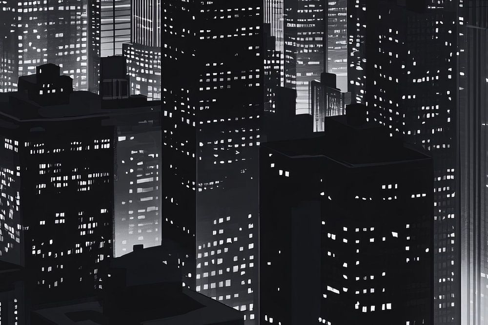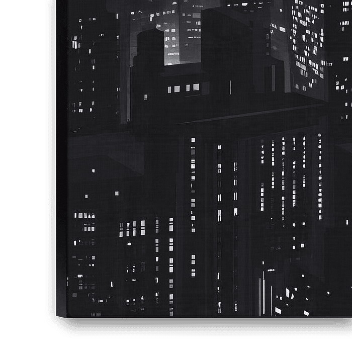Ce dessin capture l'essence d'une ville animée la nuit, dans une magnifique palette monochrome. Les bâtiments sont proches les uns des autres et sont éclairés par d'innombrables petites lumières qui scintillent comme des étoiles dans la ligne d'horizon. Cette illustration transmet une atmosphère à la fois calme et vibrante, qui conviendrait parfaitement à un intérieur moderne. Les formes détaillées et l'utilisation du contraste mettent en valeur la structure et l'architecture des bâtiments, ce qui en fait un point focal captivant dans n'importe quelle pièce. Un choix idéal pour les amateurs d'art urbain et de styles minimalistes.