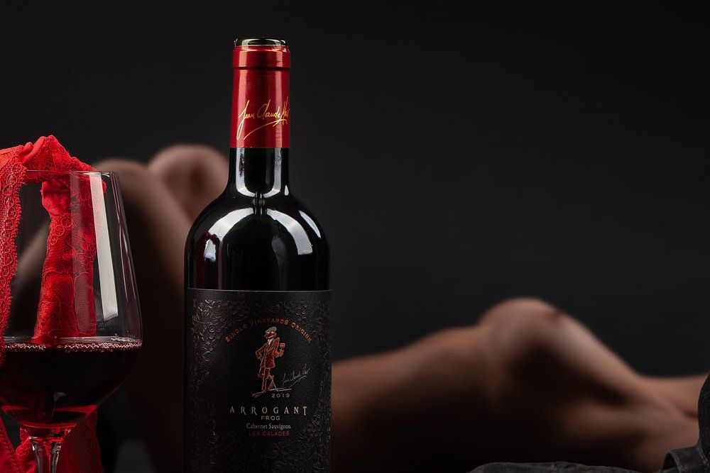 Au premier plan, un délicieux vin rouge permet de passer une soirée passionnée et romantique. Le verre gracieusement garni de jolie lingerie et les talons hauts jetés de côté.