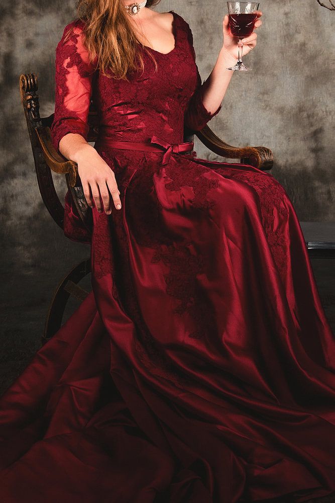 Portrait en studio d'une mannequin femme en robe rouge baroque avec un verre à vin à la main.