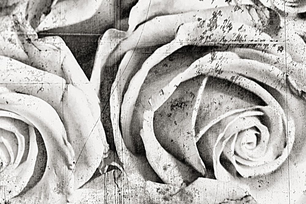 Sur la photo, on peut voir plusieurs roses épanouies, dans une optique de marbre vintage.
