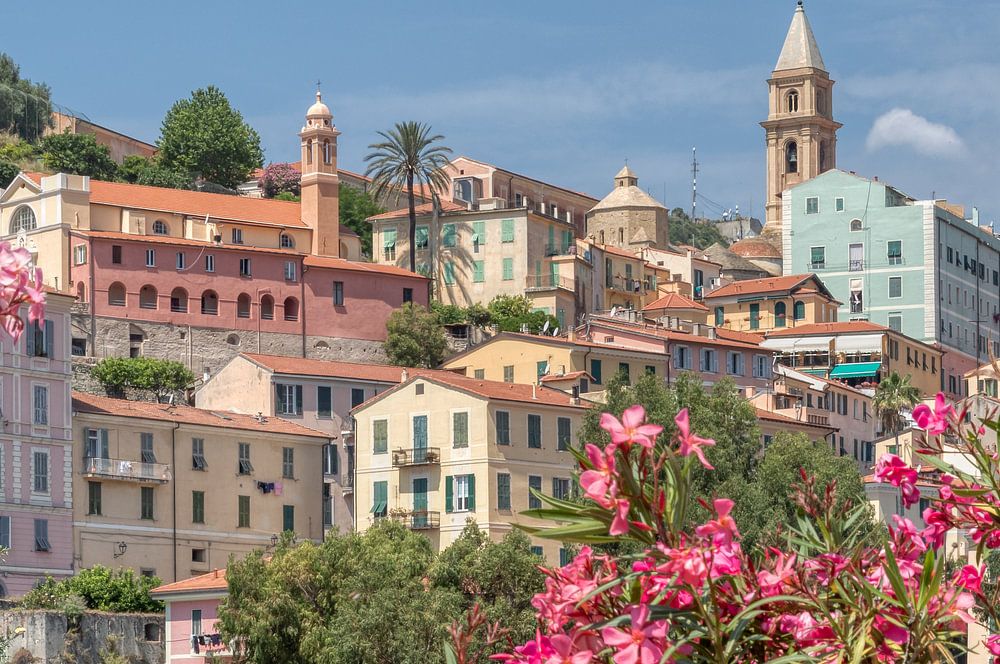 Ventimiglia Alta en Italie avec des lauriers roses au premier plan.