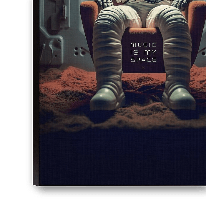 Un astronaute est assis sur une chaise ancienne sur une surface de type martien, avec une forme d'onde d'égaliseur au-dessus. Le texte se lit comme suit : "MUSIC IS MY SPACE.