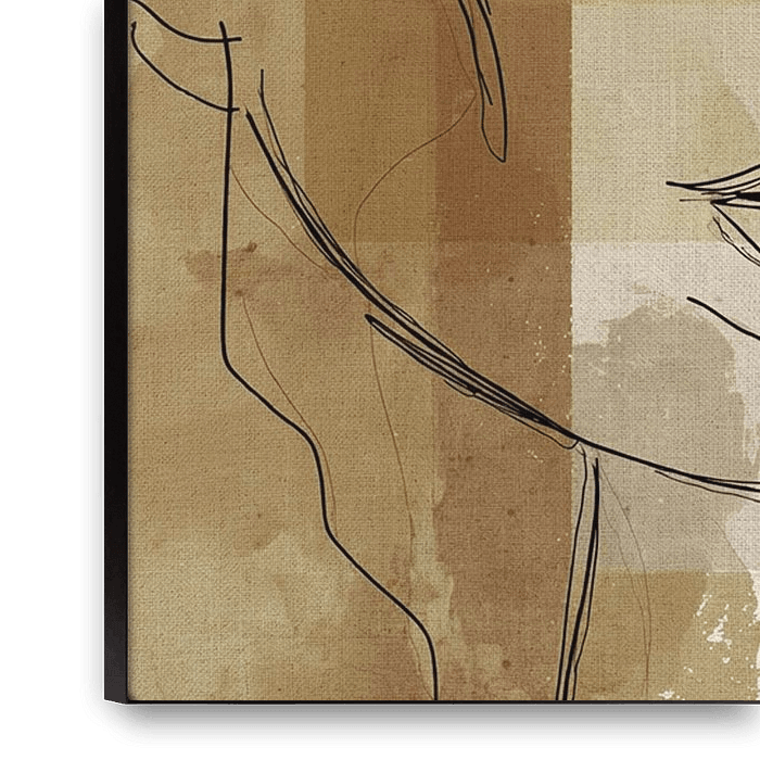 Ce qui est frappant, c'est la façon dont la ligne du visage se fond sans effort dans le plan de couleur à gauche, brouillant la frontière entre la figure et l'arrière-plan. Ce détail subtil rend l'œuvre particulièrement dynamique, malgré son exécution minimaliste. L'ensemble dégage une élégance calme qui s'intègre dans un intérieur moderne aux couleurs naturelles.