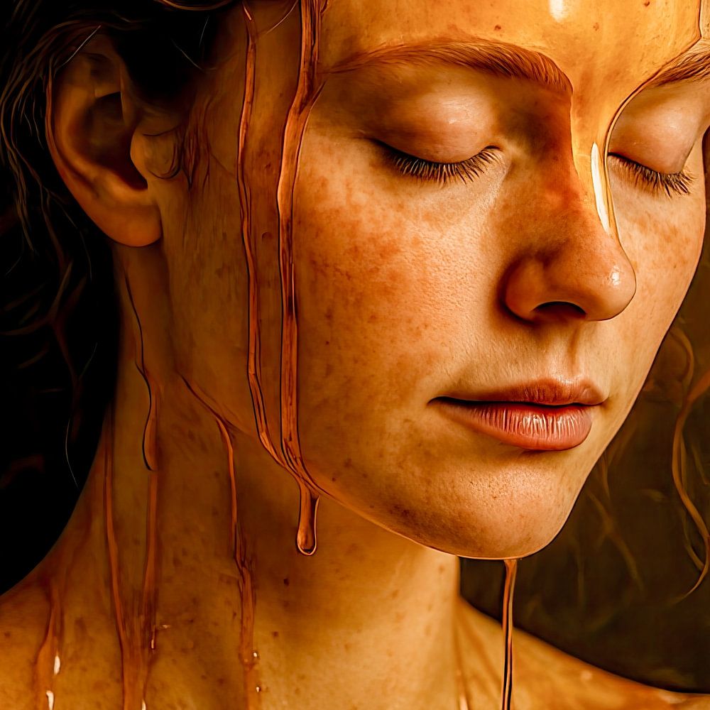 Sur son front, ses joues, son cou et ses épaules s'écoule une substance visqueuse - couleur miel, brillante, presque surnaturelle dans sa consistance. Ce n'est pas un chaos, mais un flux ordonné et calme, comme si ce qui était en elle s'était à présent extériorisé - sans précipitation, sans violence, mais comme un processus naturel d'épanouissement.