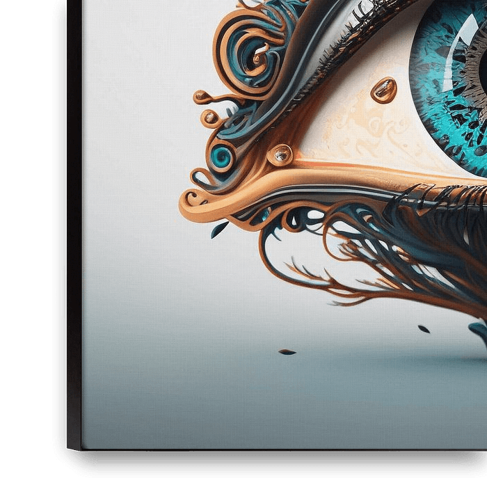 Cette œuvre d'art montre un œil bleu frappant avec un iris très détaillé, entouré de motifs organiques élégants et tourbillonnants qui rappellent les feuilles et les vignes. L'encadrement complexe de feuillages dorés et bleu-vert se fond sans heurt dans l'œil, créant une esthétique éthérée et d'outre-tombe. De minuscules éléments…