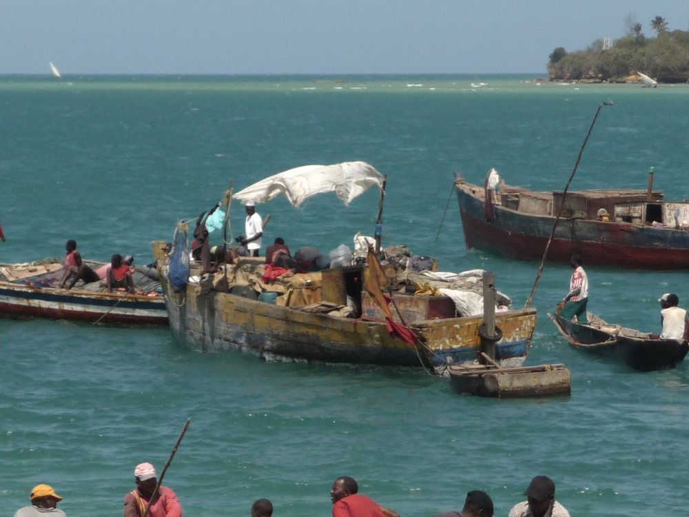 Vissers met boten voor de kust in Dar es Salaam, Tanzania- Afrika.