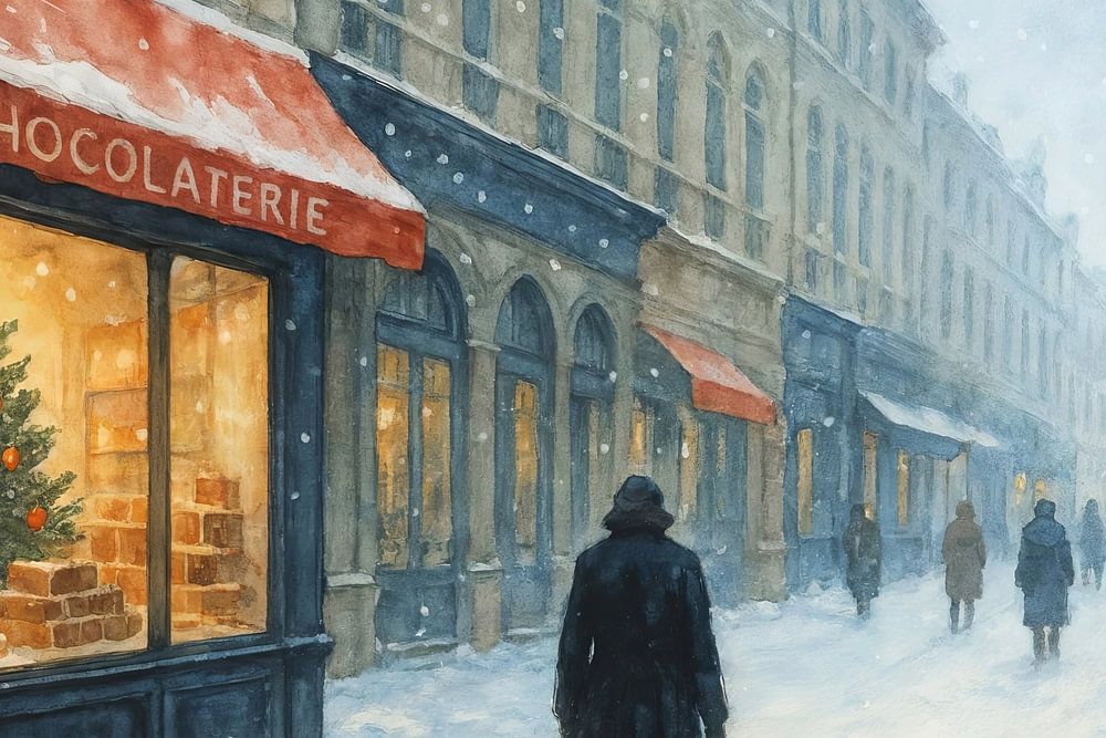 Une neige douce tombe sur une ville tranquille, tandis que les promeneurs passent lentement devant les vitrines joliment éclairées. Au premier plan, la lueur chaude d'une chocolaterie attire l'attention, avec un sapin de Noël entre des piles de boîtes de luxe, comme si la lumière voulait vous attirer à l'intérieur pour un moment. Les auvents rouge et blanc, les lanternes classiques et les hautes façades confèrent à l'endroit une élégance presque parisienne.
