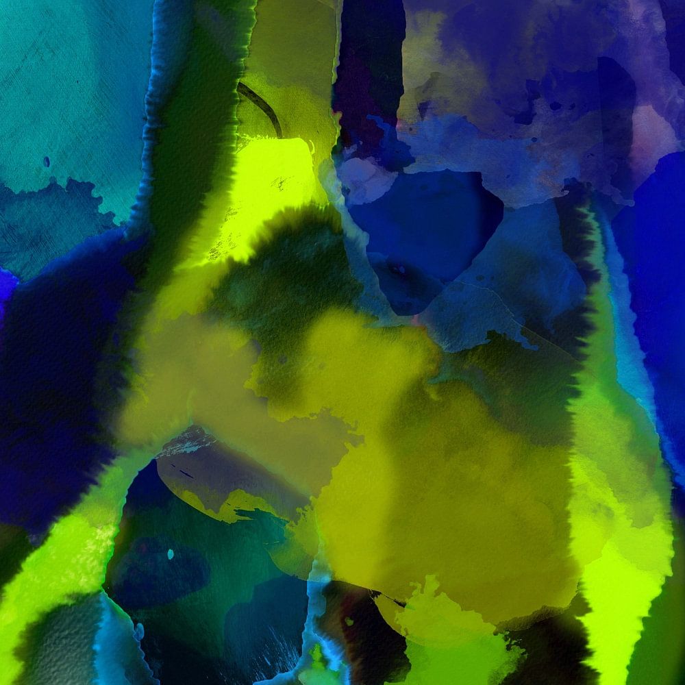 Une aquarelle abstraite vivante aux couleurs mélangées, dont le bleu profond, le bleu-vert, le vert et le jaune. L'œuvre se compose principalement de formes larges et irrégulières et d'éclaboussures. L'atmosphère générale est énergique et expressive.