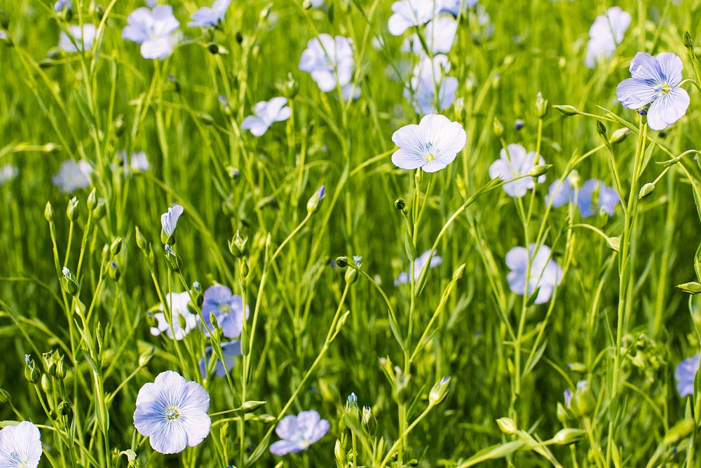 In dit frisgroene veld bloeiende paarse vlasbloemen waan je je meteen op vakantie, je voelt en ruikt het begin van de zomer. Een sfeertje dat je zelf putje winter terug een heerlijk warm gevoel geeft.