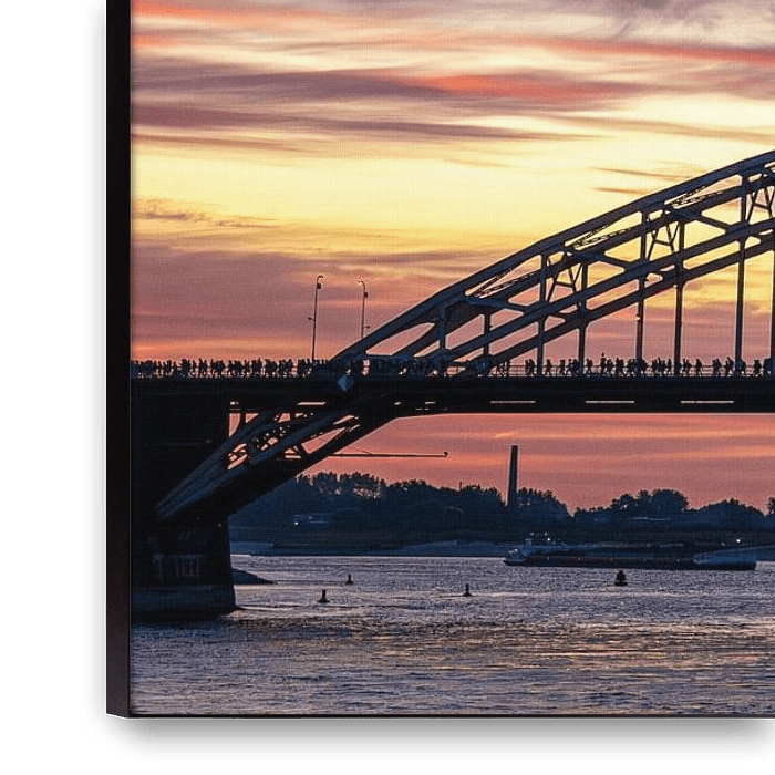 Le départ de la marche de quatre jours de Nimègue. Tôt le matin, les marcheurs traversent le pont Waal de Nimègue à l'aube. Ils commencent leur journée à Elst, parcourant une distance de 30, 40 ou même 50 kilomètres. Le fait de me lever très tôt m'a permis de prendre cette photo de manière à ce que la silhouette du pont et des…