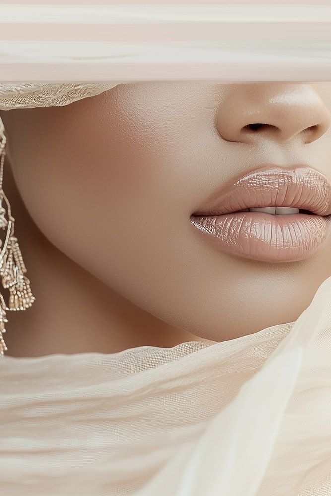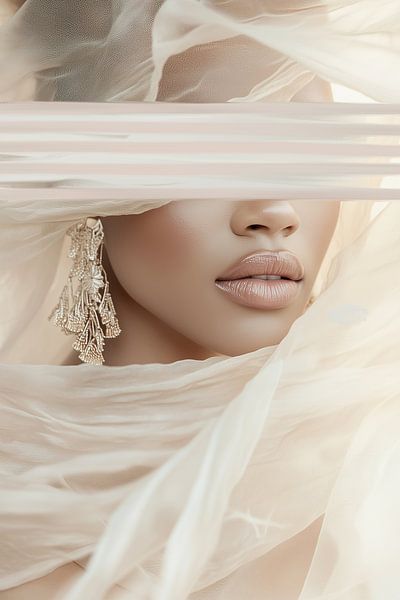 L'arrière-plan est harmonieusement relié à son foulard, un magnifique lin blanc-beige qui se fond élégamment dans son environnement, donnant au portrait une unité fluide et organique. La texture du lin suggère la douceur et la tactilité, transmettant un sentiment de calme et de sérénité intemporelle. Une délicate boucle d'oreille en coquillage blanc et beige pend à son oreille, un petit détail significatif qui ajoute de la sophistication et un accent subtil à la composition.