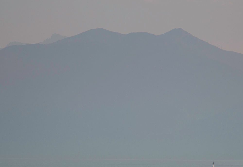 Le matin, sur un lac en Italie. Avec des montagnes brumeuses en arrière-plan.