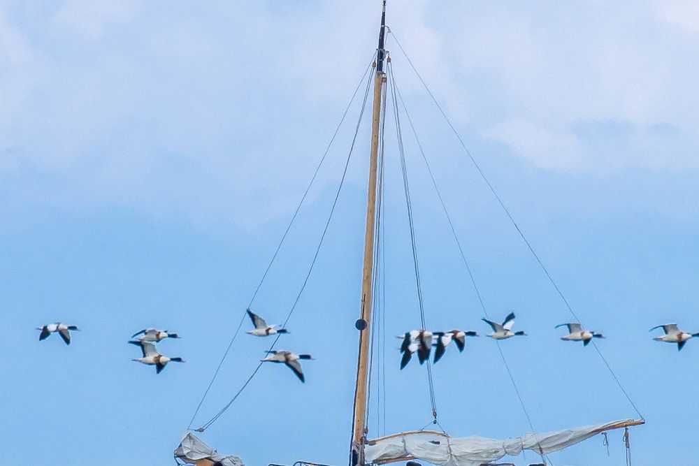 La photo montre un magnifique voilier. Le bateau navigue sur la mer des Wadden, près de Koehool. Au moment où la photo est prise, un troupeau d'oies passe à proximité.