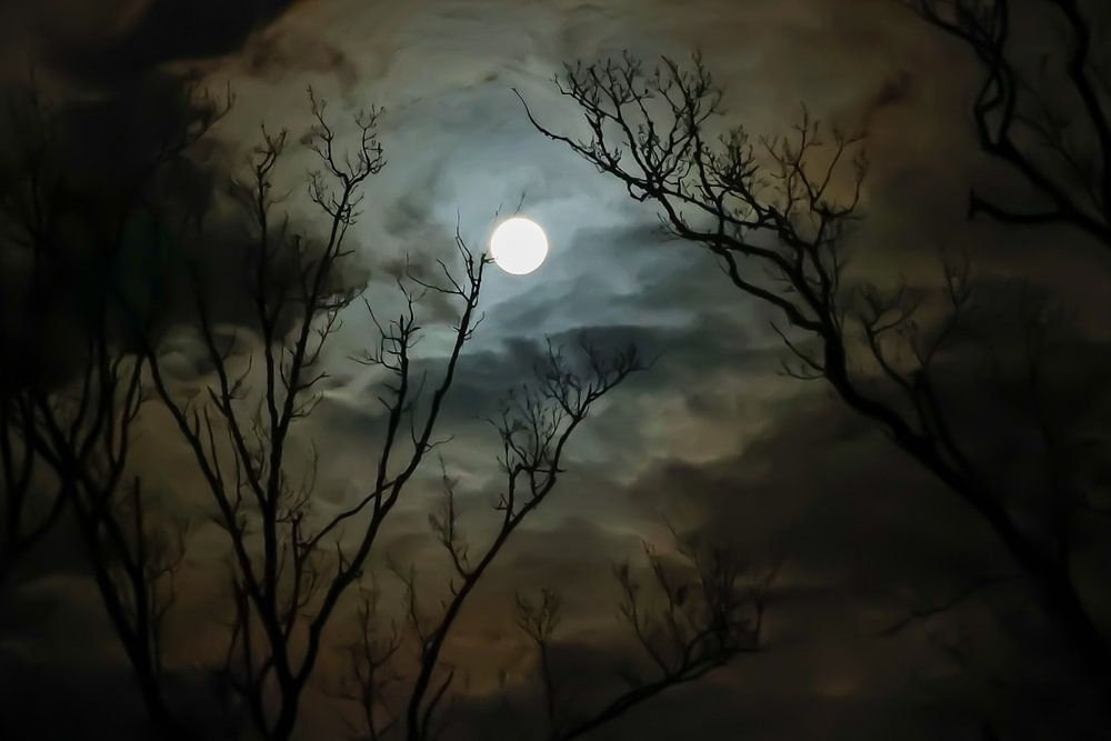 La belle lune qui brille à travers les arbres par une belle soirée claire.