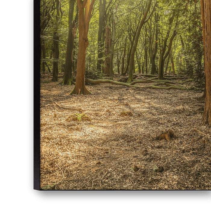 Belle journée d'été dans la forêt de Speulder. Le soleil traverse à peine le feuillage, illuminant le sol parsemé de branches et de feuilles.