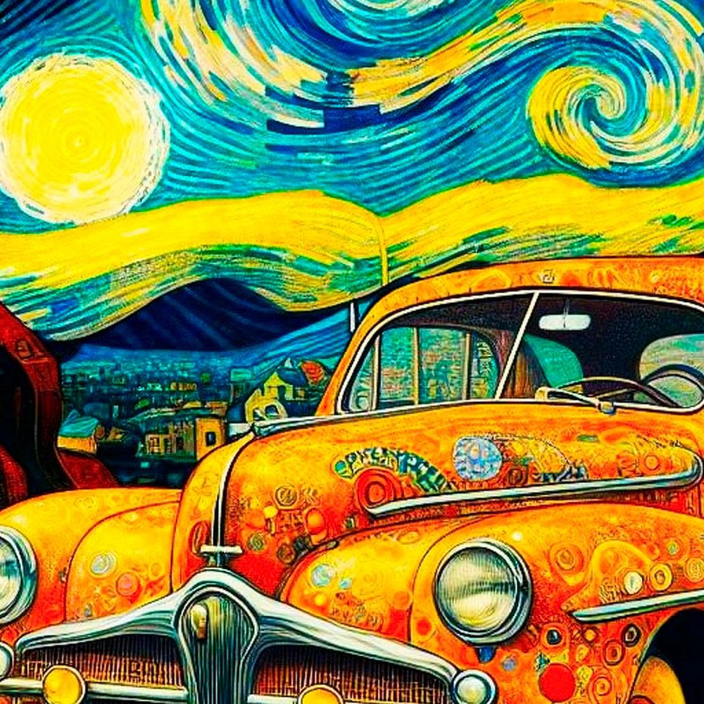 Avec A.I.art, nous avons créé des illustrations joyeuses de voitures, inspirées par l'art coloré de Gustav Klimt et Vincent van Gogh.