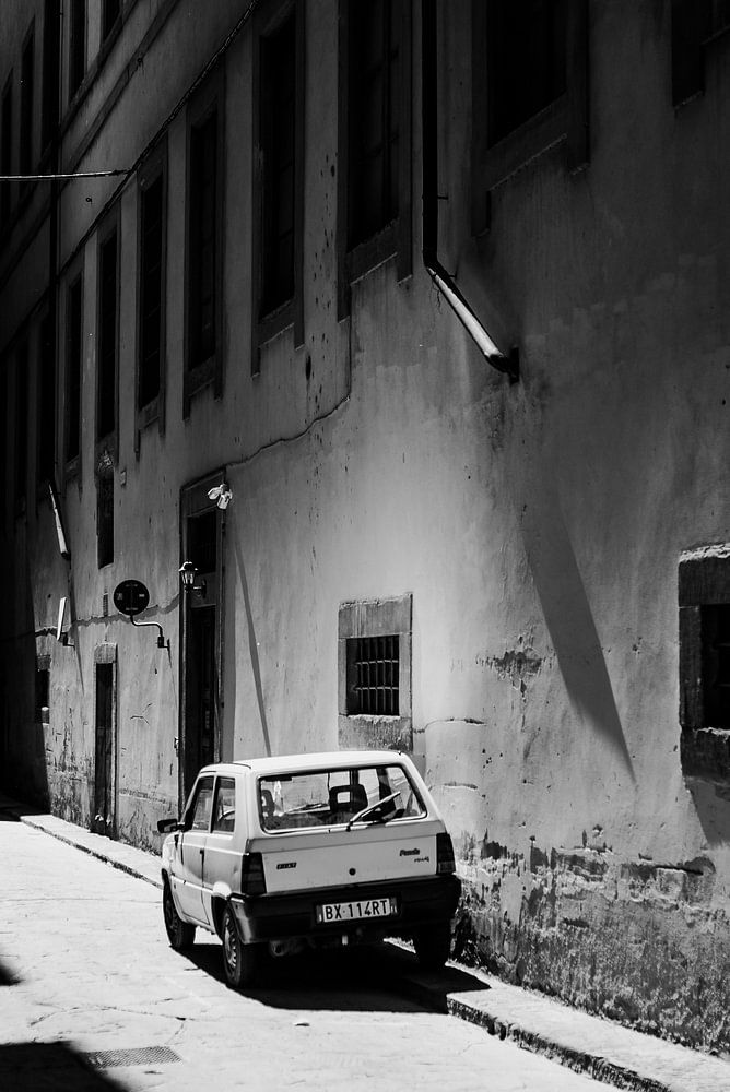 Vieille voiture dans les petites rues de Florence, Toscane, Italie en noir et blanc. La voiture était en plein soleil, ce qui la fait ressortir magnifiquement dans la lumière, à côté des ombres dures des bâtiments.
