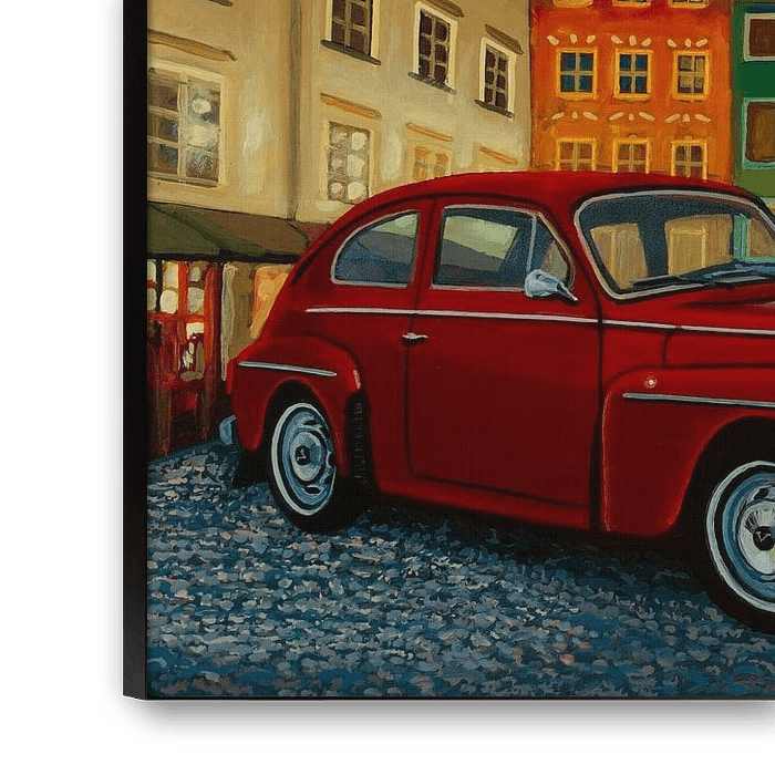 Deux voitures anciennes, l'une rouge et l'autre bleue, se tiennent sur une place pavée. Elles sont entourées de bâtiments historiques colorés aux façades complexes, sous un ciel dramatique et enflammé.