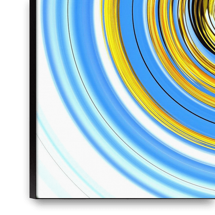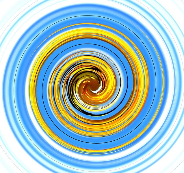 Cette spirale numérique traduit une impression de mouvement et d'énergie en faisant se fondre, au centre, des teintes chaudes de jaune et d'orange dans des anneaux froids de bleu et de blanc. L'image dégage une impression de dynamisme, d'hypnotisme et de quasi-cosmicité, comme si l'on était aspiré dans un vortex de lumière.