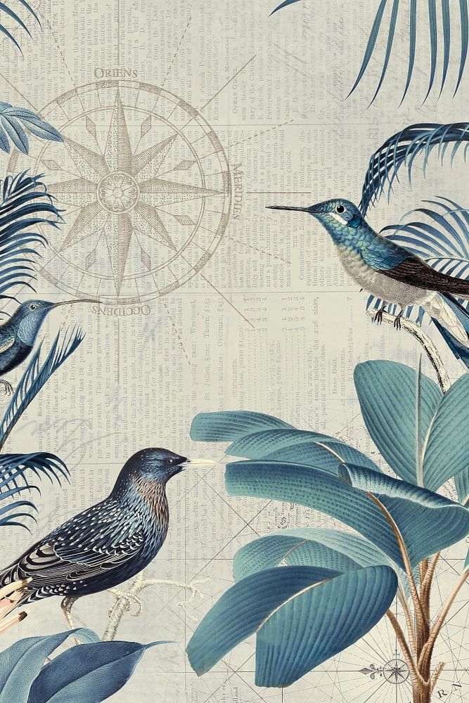 Illustration avec oiseaux, palmiers et végétation tropicale, éléments de boussole et de carte rappelant les voyages des grands explorateurs vers des terres lointaines.