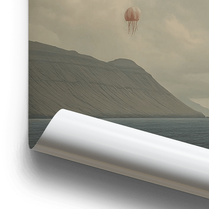 Une femme seule, une petite valise à la main, contemple depuis la côte une mer calme s'étendant entre deux chaînes de montagnes sombres. Au-dessus d'elle, plusieurs méduses géantes rayées de rouge et de blanc flottent dans le ciel comme des ballons silencieux. La scène semble à la fois réelle et onirique : la lumière tamisée, le paysage…