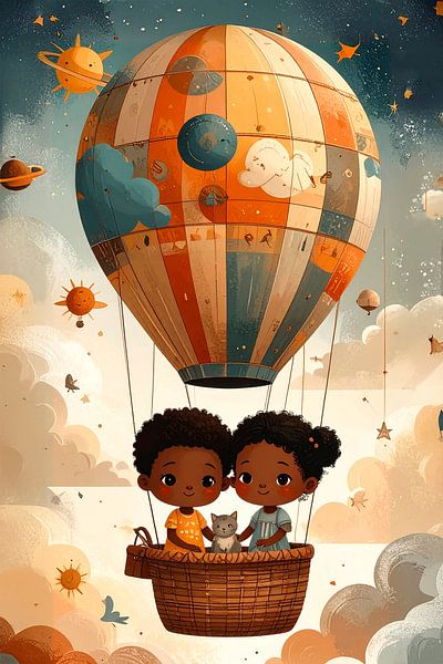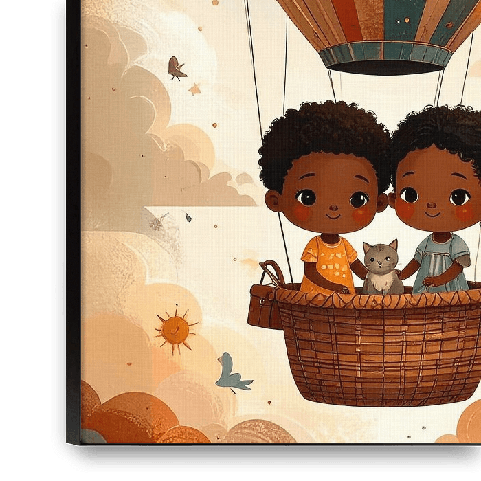 Illustration de deux enfants à la peau foncée, un garçon et une fille, voyageant ensemble dans une montgolfière. Ils transportent une valise de voyage et leur chat. Flottant parmi les nuages, ils profitent de leur amitié, pure et réelle, un moment magique. Les couleurs douces et la lueur chaude rendent la scène encore plus rêveuse.…