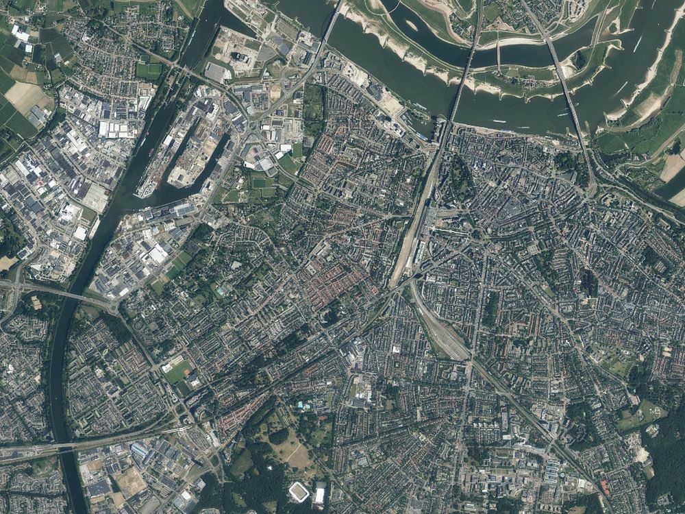 Cette photo aérienne de la ville de Nimègue a été obtenue en déployant diverses techniques SIG sur des données ouvertes. La photo aérienne a été traitée avec différents filtres afin de faire ressortir certains détails. Il est possible que des artefacts sous forme de bandes soient encore visibles en raison des décalages horaires pendant le vol.