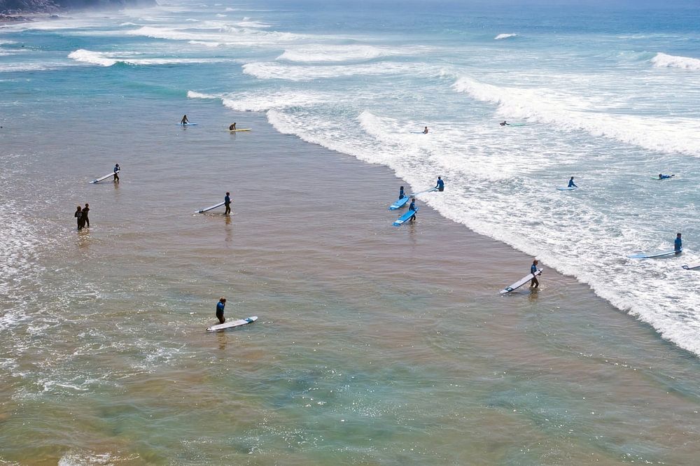 Vue aérienne de la plage de Vale Figueiras sur la côte ouest du Portugal, remplie de surfeurs.