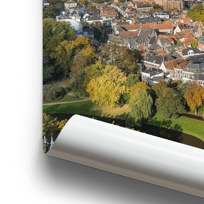 Vue aérienne du centre-ville de Zwolle au niveau de la Sassenpoort par une belle journée d'automne. Vue d'en haut, on peut voir le feuillage d'automne des arbres et divers bâtiments historiques à l'arrière-plan. La Sassenpoort a été construite au XIVe siècle, plus précisément entre 1406 et 1409, et constituait l'une des principales entrées de la ville fortifiée de Zwolle. Elle a été construite dans le cadre des murs de défense de la ville et était principalement utilisée pour contrôler l'accès à la ville, ainsi que pour protéger ses habitants des menaces potentielles. Le nom de la porte, "Sassenpoort," ; se traduit par "Saxon Gate" ; en anglais, ce qui fait référence aux marchands de la région saxonne qui passaient par cette entrée dans la ville. La Sassenpoort occupait une position stratégique à un endroit crucial des murs de défense de la ville, reliant le centre de la ville à la région située à l'est. De forme rectangulaire, elle a une hauteur d'environ 38 mètres et une largeur d'environ 20 mètres. La porte est ornée d'éléments décoratifs, notamment de flèches, de créneaux et de tourelles, qui lui confèrent un aspect distinctif et imposant.