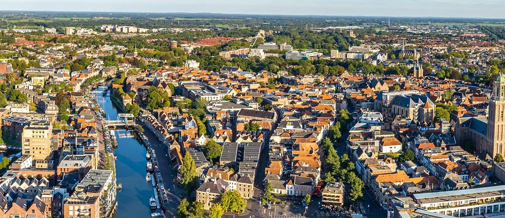 Vue aérienne du centre-ville de Zwolle lors d'un coucher de soleil à la fin de l'été. Vu d'en haut, on peut voir plusieurs bâtiments historiques, tels que le clocher de l'église Peperbus, le Sassenpoort et le musée Fundatie avec le design moderne sur le toit.