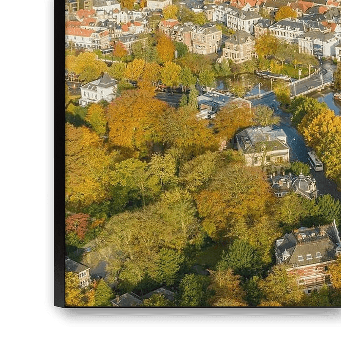 Vue aérienne du centre-ville de Zwolle lors d'une matinée d'automne avec un ciel sombre et orageux. Vu d'en haut, on peut voir le feuillage d'automne des arbres et divers bâtiments historiques en arrière-plan, tels que le clocher de l'église Peperbus et la porte de Sassenpoort.