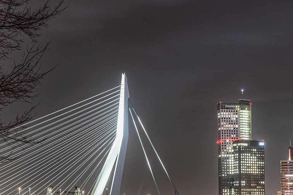 Le soir, à la tombée de la nuit, le vent soufflant sombrement dans les cheveux, se promener sur les rives de la Meuse. Ici, sous un certain angle, sur les quais de Veerhaven, de l'autre côté de la Meuse. À travers les cordes du pont Erasmus, on aperçoit le Hef. Un petit morceau de l'horizon de Rotterdam de l'autre côté de la Meuse.