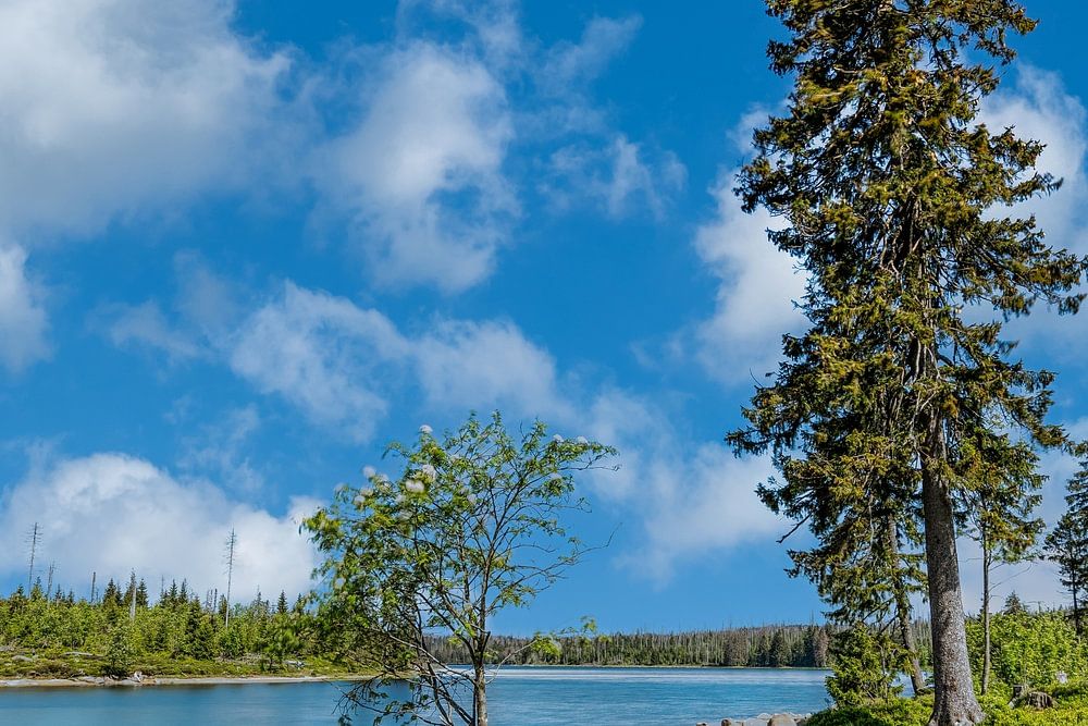 Vue de l'Oderteich dans les montagnes du Harz sous un ciel bleu.