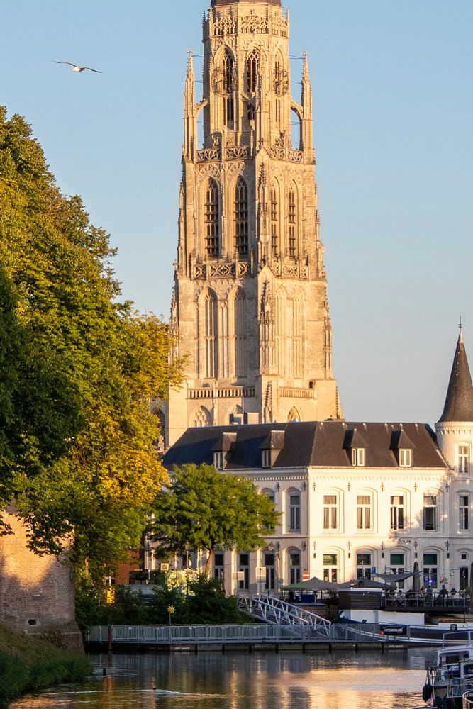 En tant que photographe amateur, j'aime prendre mon appareil photo reflex Canon EOS 800D pour prendre des photos de Breda, ma ville natale. Cette photo a été prise sur le quai en herbe sous le pont Koning Willem-Alexander le 1er août 2022 vers 19h30. Sur cette photo estivale, on peut voir non seulement l'emblématique Grande église ou église Notre-Dame, mais aussi le port et le Spanjaardsgat. Le nombre de bateaux dans les canaux de Breda augmente rapidement, comme on peut le voir sur le côté droit de la photo. L'oiseau volant à gauche de la Grande Église complète l'image pour moi. Il n'y a pas un nuage dans le ciel.