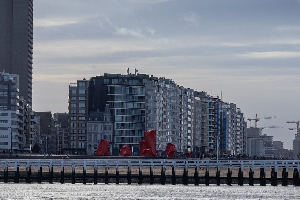 Un paysage marin paisible avec, en arrière-plan, la ligne d'horizon de la ville d'Ostende, en Flandre occidentale (Belgique). Une jetée s'avance dans l'eau, avec des œuvres d'art public rouges, les "rock stangers", qui contrastent avec les tons gris bleus des bâtiments et du ciel.