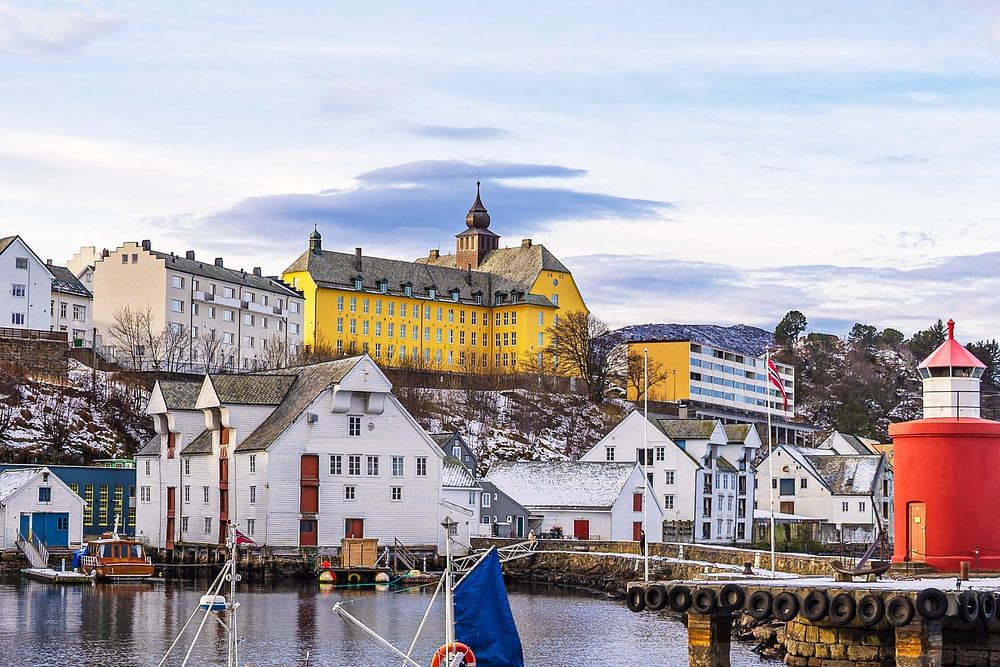 A propos de "Vue de la ville d'Ålesund avec la tour de Molen et le bateau de pêche en No"