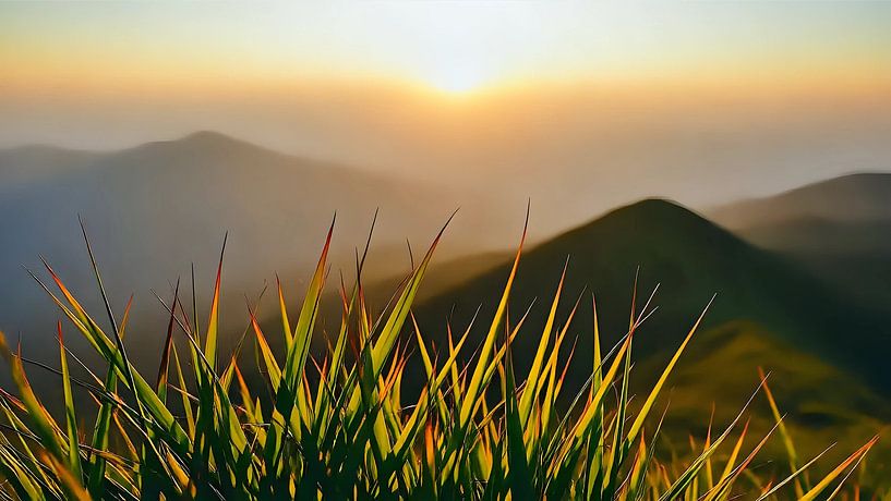 Cette photo présente une macro intime d'un brin d'herbe sauvage dans les montagnes au coucher du soleil, capturant un moment fugace de silence et de chaleur. Au premier plan se trouve un seul brin d'herbe, dont les fines structures capillaires et les minuscules gouttes de rosée sont clairement visibles, bien que la faible profondeur de champ transforme l'environnement en un bokeh doux. La chaude lumière du soir du soleil couchant dépose une lueur dorée sur l'herbe et crée des reflets délicats le long des bords, tandis que les ombres sont longues et douces sur les brins. Le filtre vintage confère à l'image une ambiance nostalgique : les couleurs sont légèrement désaturées, les contrastes sont atténués et un subtil effet de grain cinématographique se pose sur la scène comme un souvenir. En arrière-plan, les silhouettes des montagnes ne se dessinent que vaguement, dans des tons orangés pastel et des violets délavés, qui se fondent sans transition dans le ciel. La composition se concentre sur la texture et la lumière ; chaque brin d'herbe ressemble presque à un dessin au pinceau, tandis que le flou confère à l'image de la profondeur et une intimité presque onirique. On ressent l'immensité du paysage de montagne sans qu'elle ne domine le regard - au lieu de cela, l'image attire l'attention sur ce qui est petit, fragile et pourtant permanent dans la nature. Dans l'ensemble, la scène transmet une sérénité tranquille, estivale, un mélange de mélancolie et de beauté paisible qui invite le spectateur à s'attarder et à reprendre son souffle.