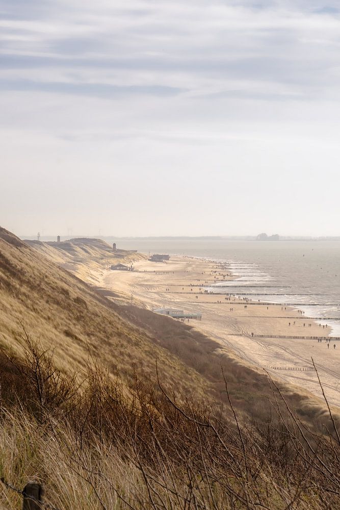 Lors d'une promenade hivernale à travers les dunes de Zoutelande, j'ai eu une très belle vue sur la plage où l'on peut voir les promeneurs comme de petits points au loin ainsi que sur la mer où plusieurs navires (cargo) ont leurs couloirs de navigation. La photo a une atmosphère hivernale mais reste agréable à regarder grâce à la vue sur la plage et la mer.