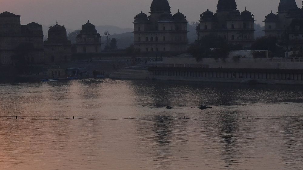 Depuis le pont qui enjambe la rivière, on a une vue magnifique sur les chhatris royaux d'Orchha. Un chhatri est un petit pavillon semi-ouvert, surélevé et coiffé d'un dôme, utilisé comme élément dans l'architecture indo-islamique et dans l'architecture indienne. Ces pavillons ont généralement une base carrée, octogonale ou ronde et le dôme est soutenu par quatre piliers ou plus. Les chhatris sont souvent des pavillons ornementaux sur les toits de bâtiments séculaires, commémoratifs ou sacrés.